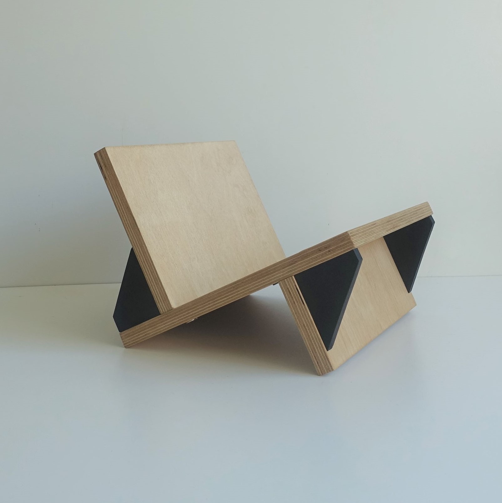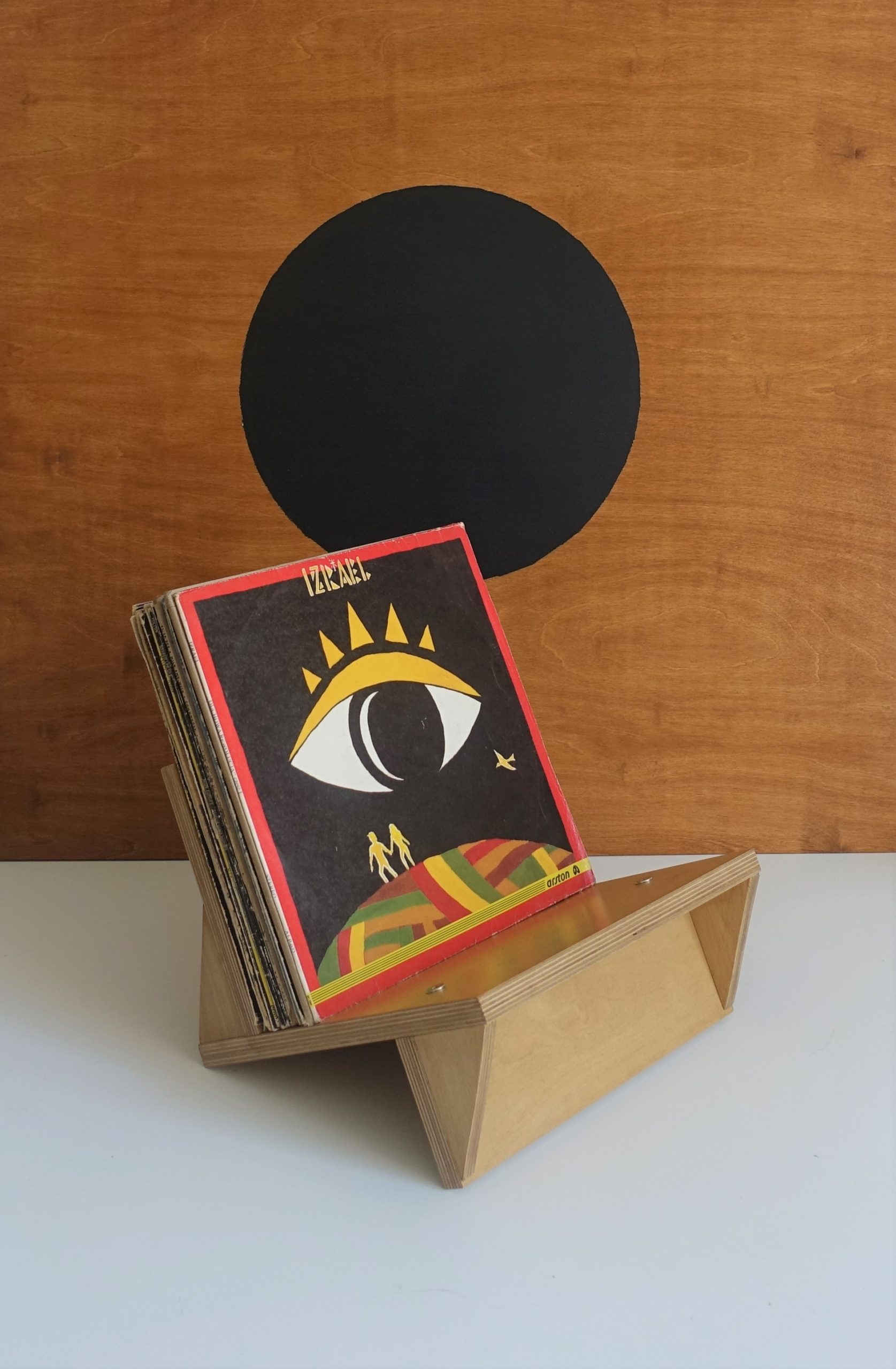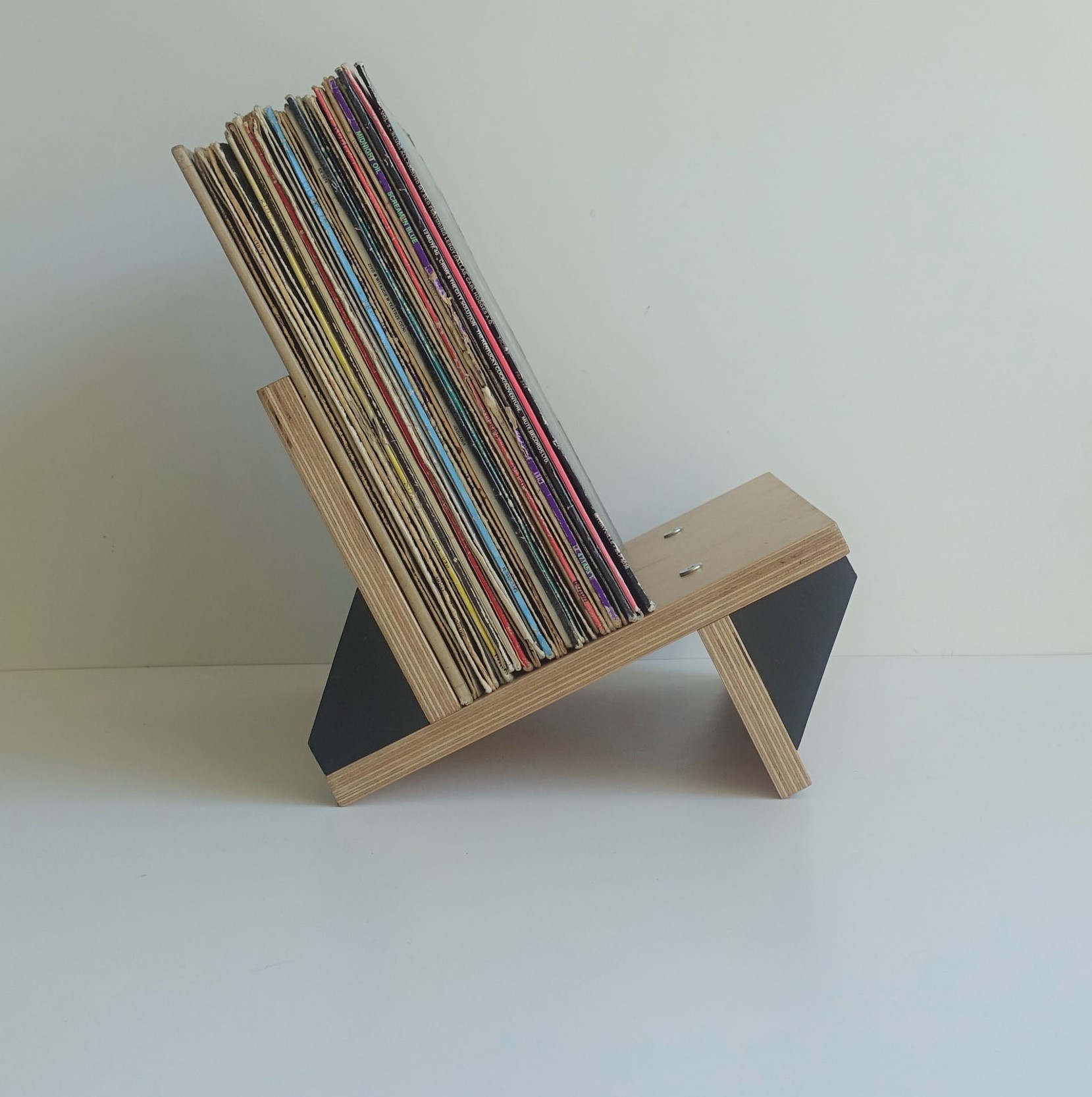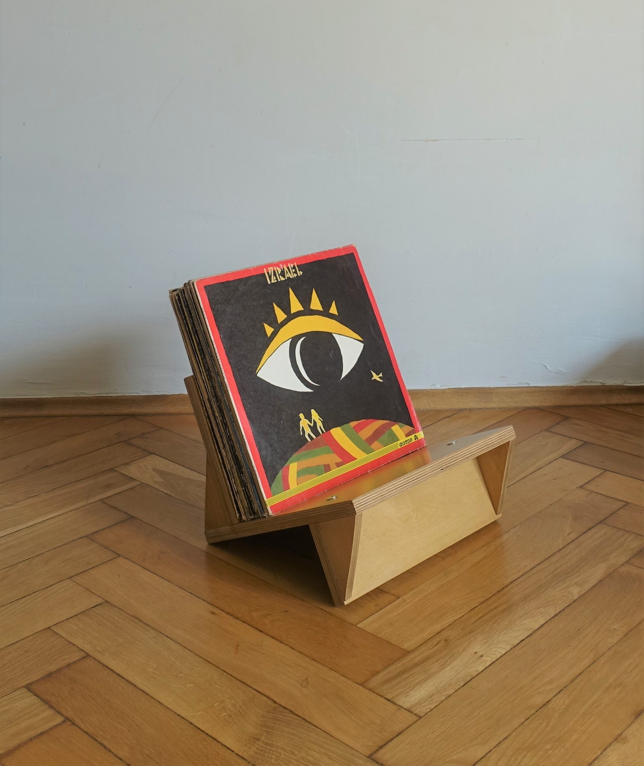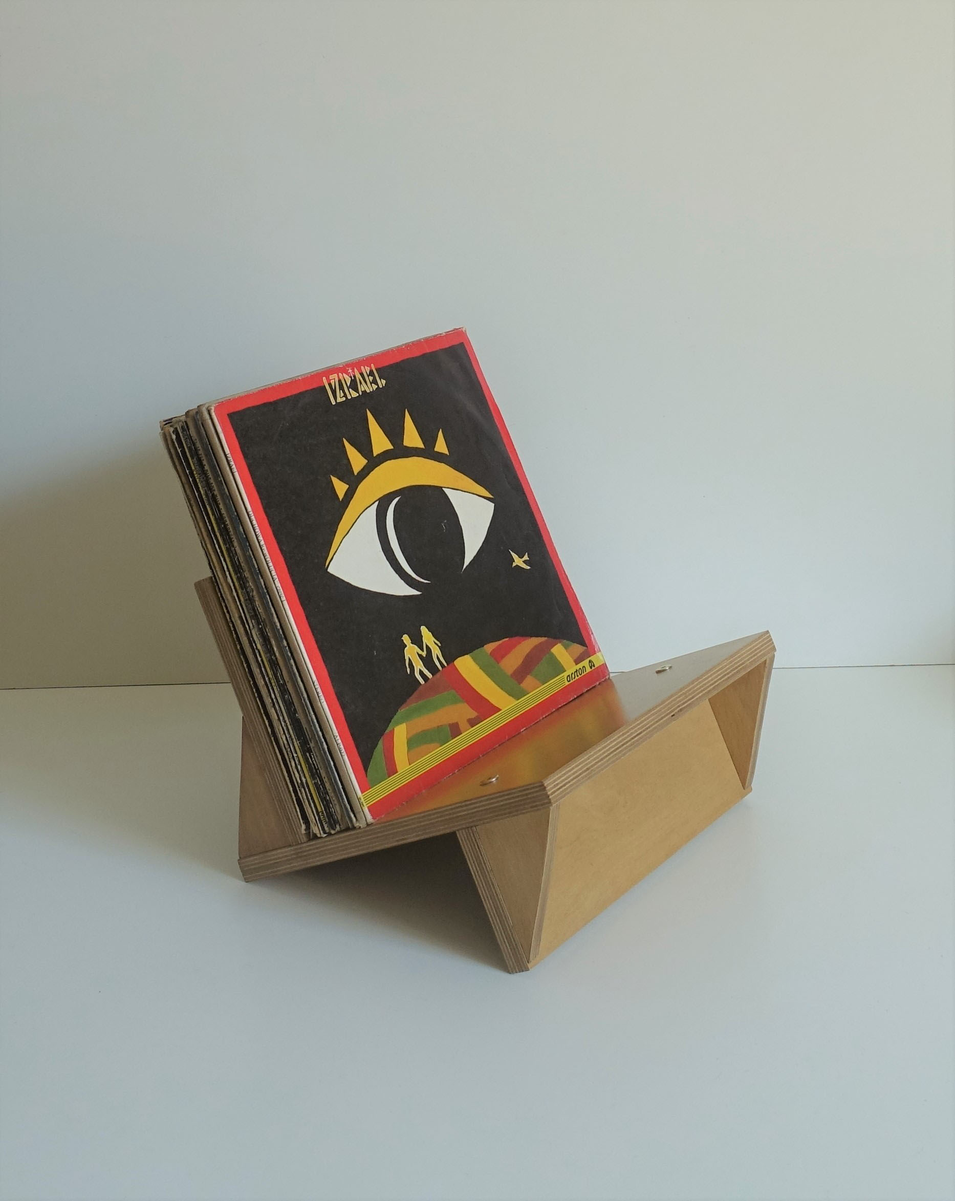 Stojak na winyle, gazety lub książki. Wiele funkcji, oryginalny design. Minimalizm. Idealnie wyważony, zmieści się na nim około 70 płyt. Stojak zrobiony jest ze sklejki grubości 18mm oraz 12mm. Wykończony wodnym, ekologicznym lakierem bezbarwnym oraz farbą wodną.