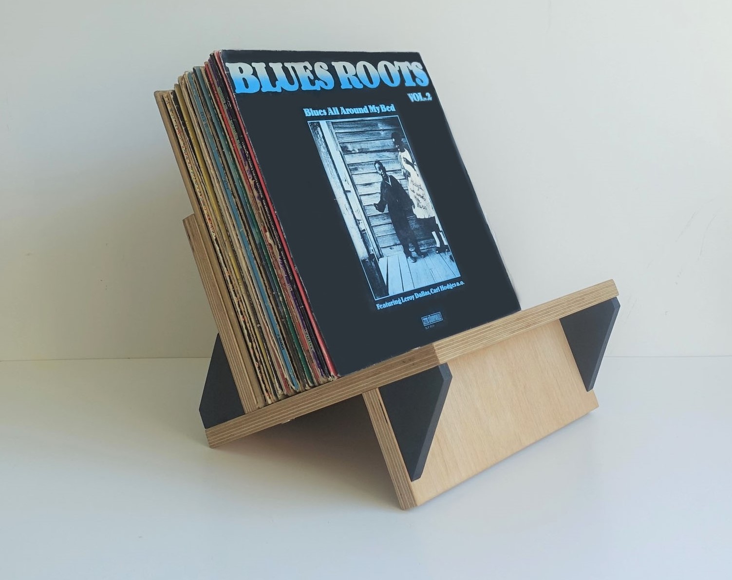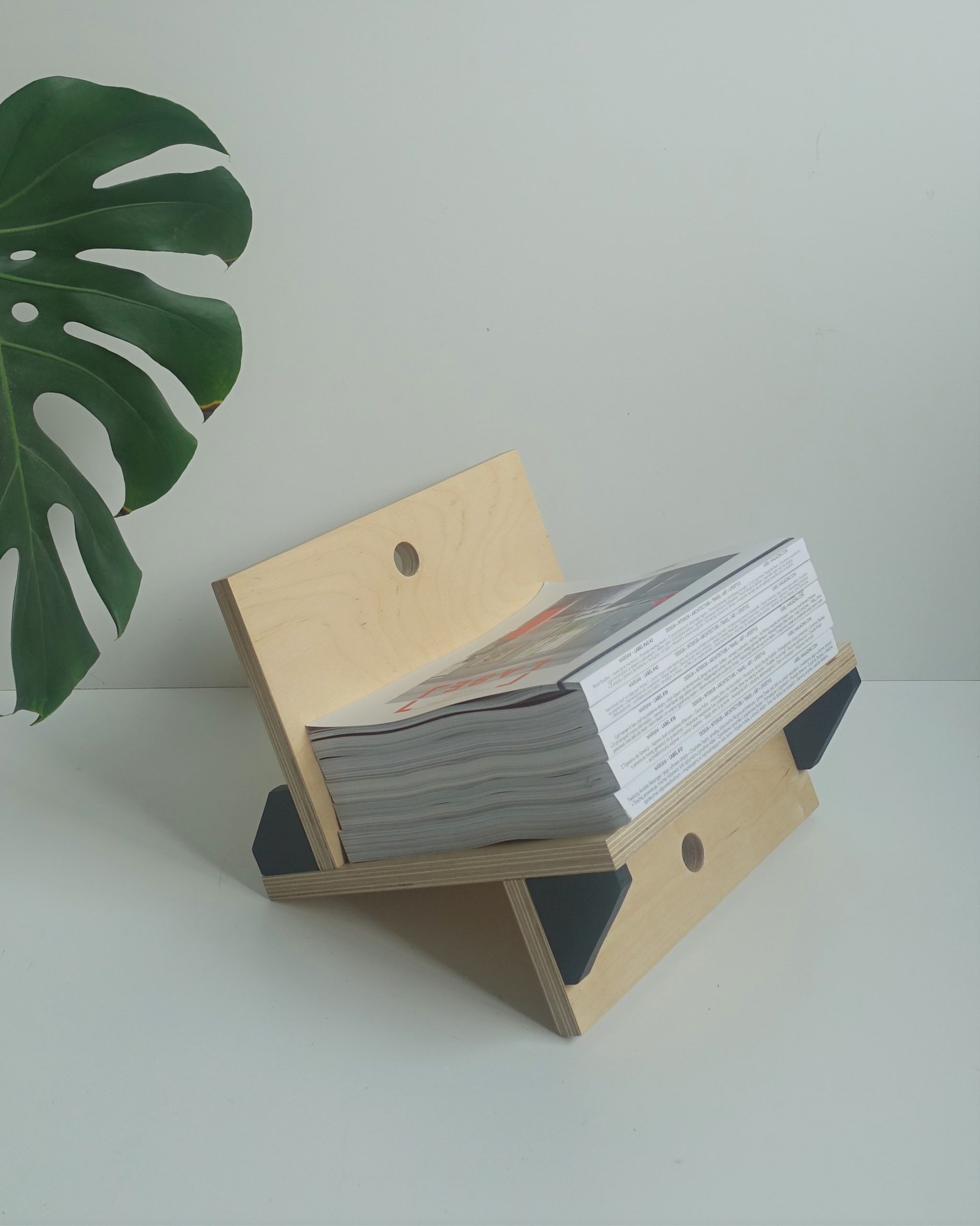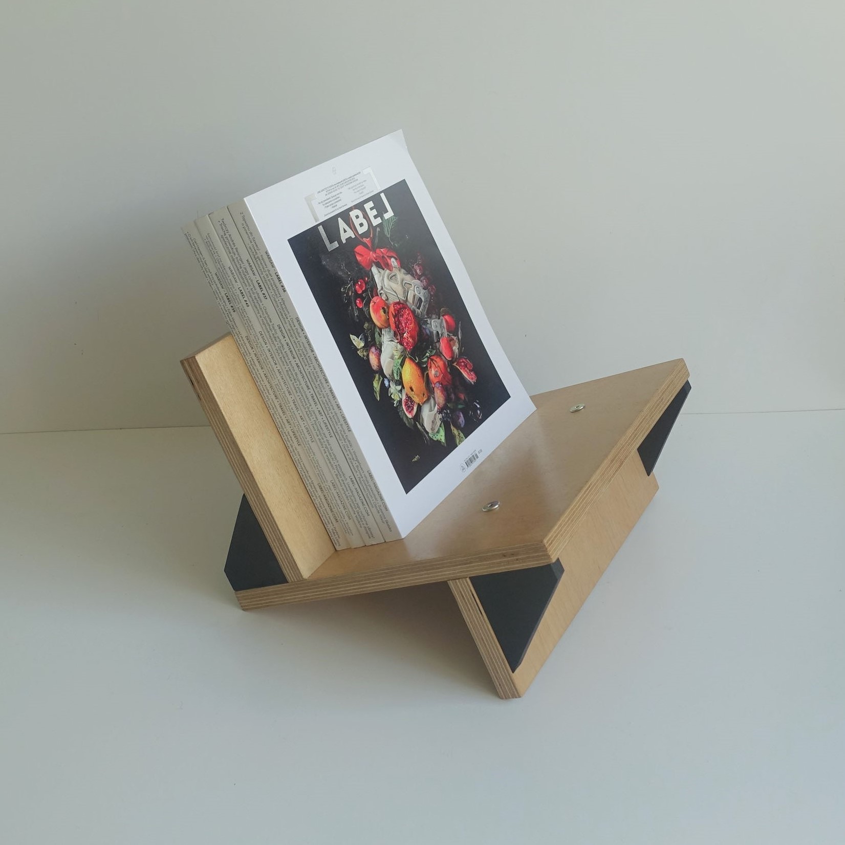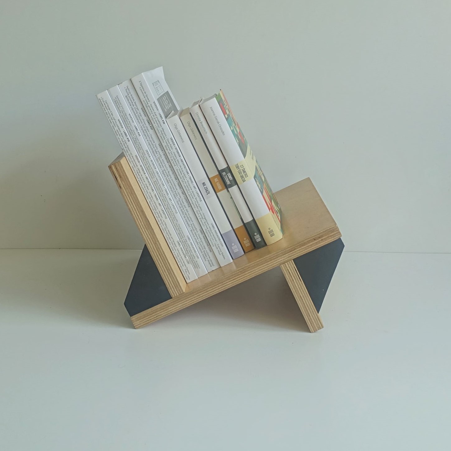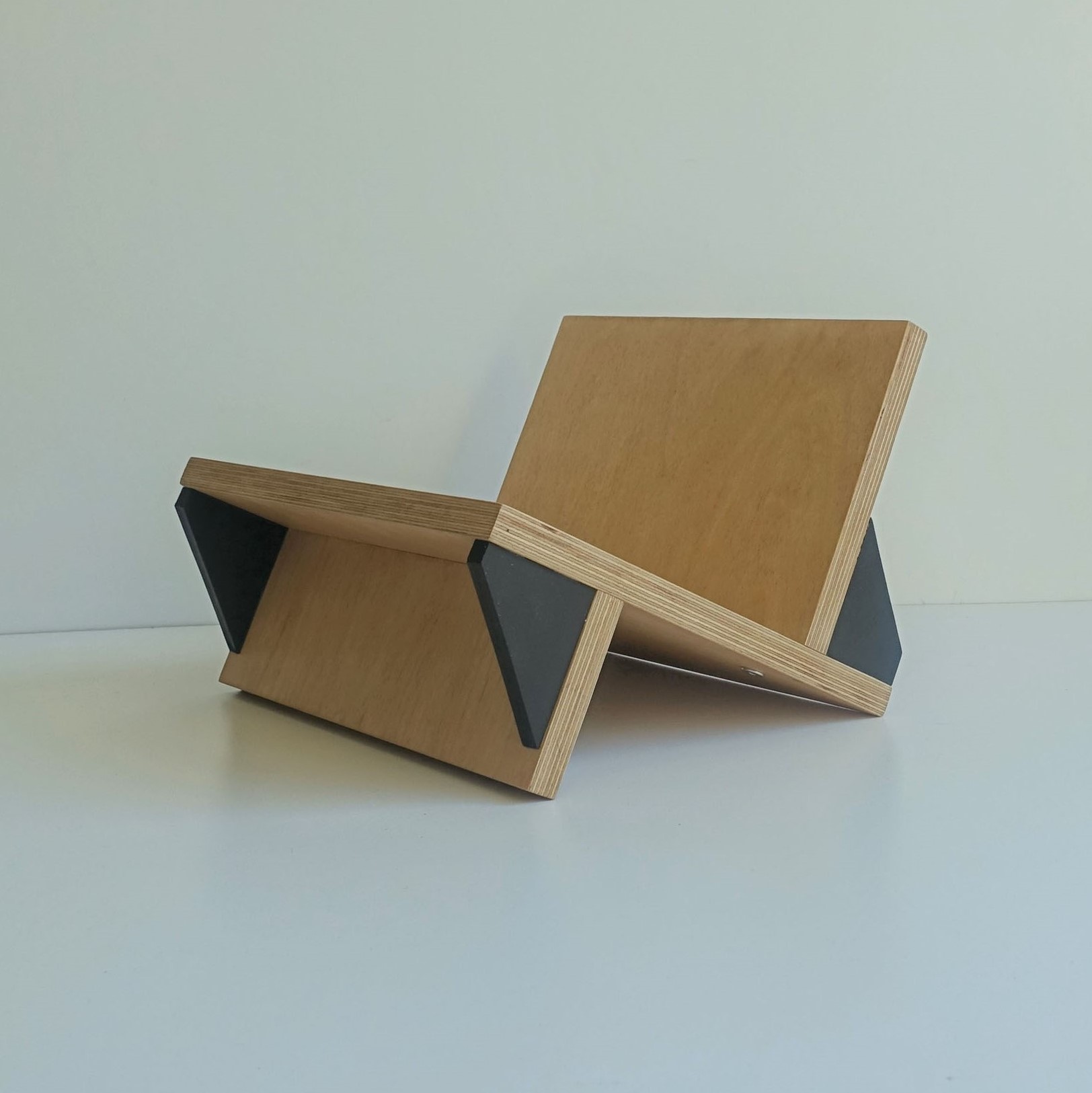 Stojak na winyle, gazety lub książki. Wiele funkcji, oryginalny design. Minimalizm. Idealnie wyważony, zmieści się na nim około 70 płyt. Stojak zrobiony jest ze sklejki grubości 18mm oraz 12mm. Wykończony wodnym, ekologicznym lakierem bezbarwnym oraz farbą wodną.