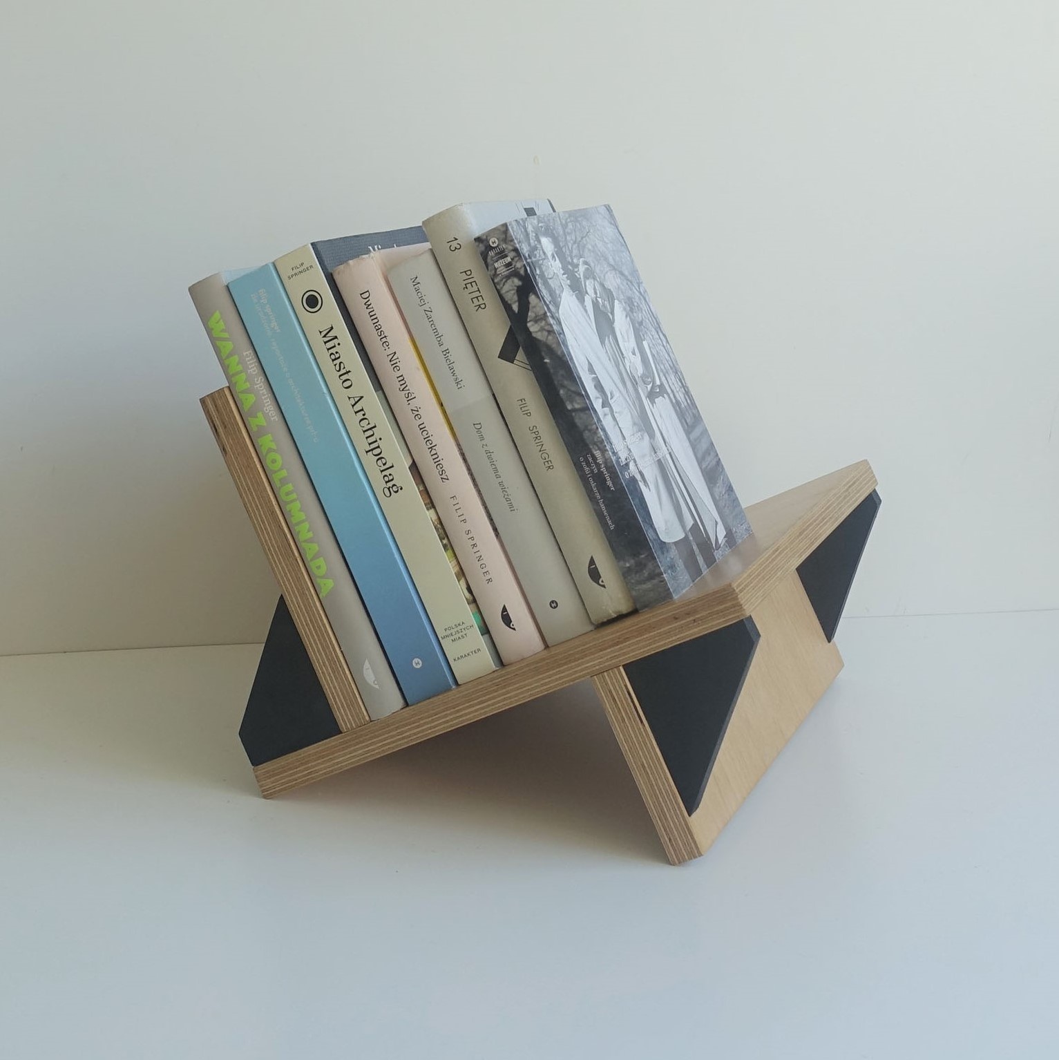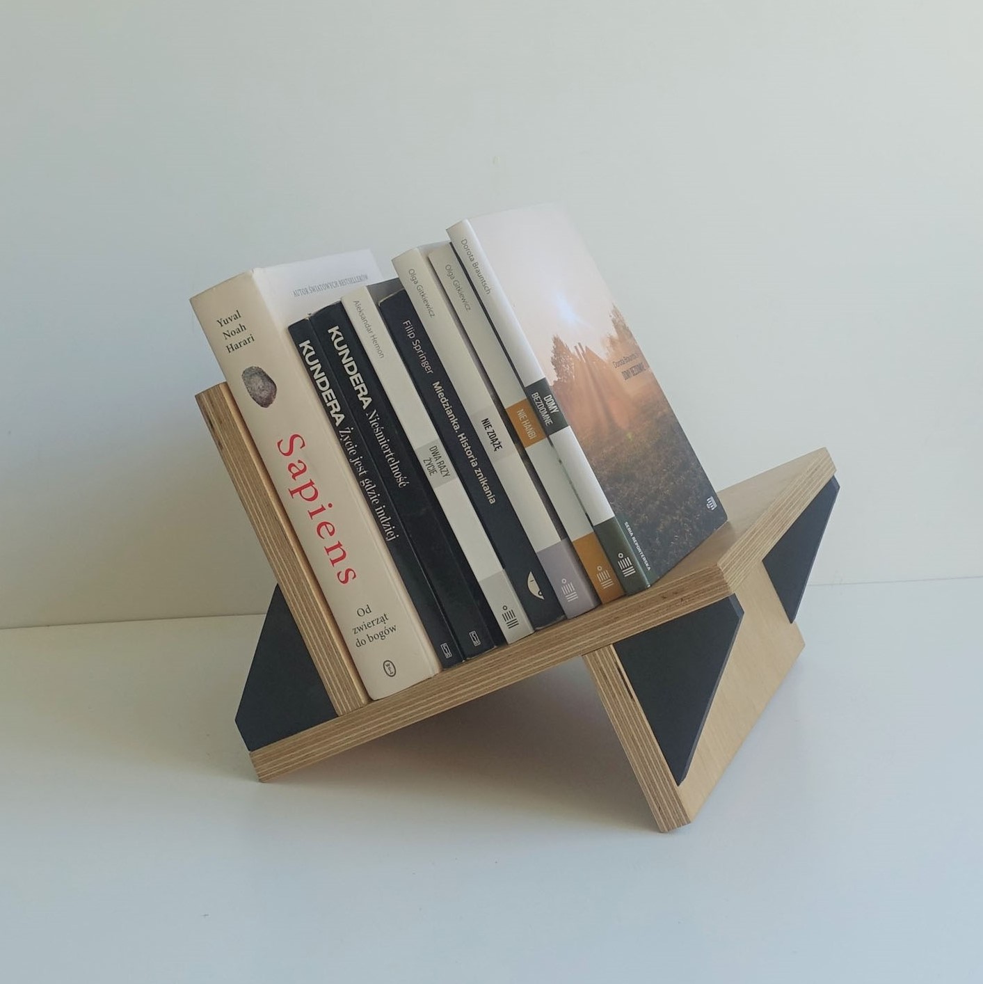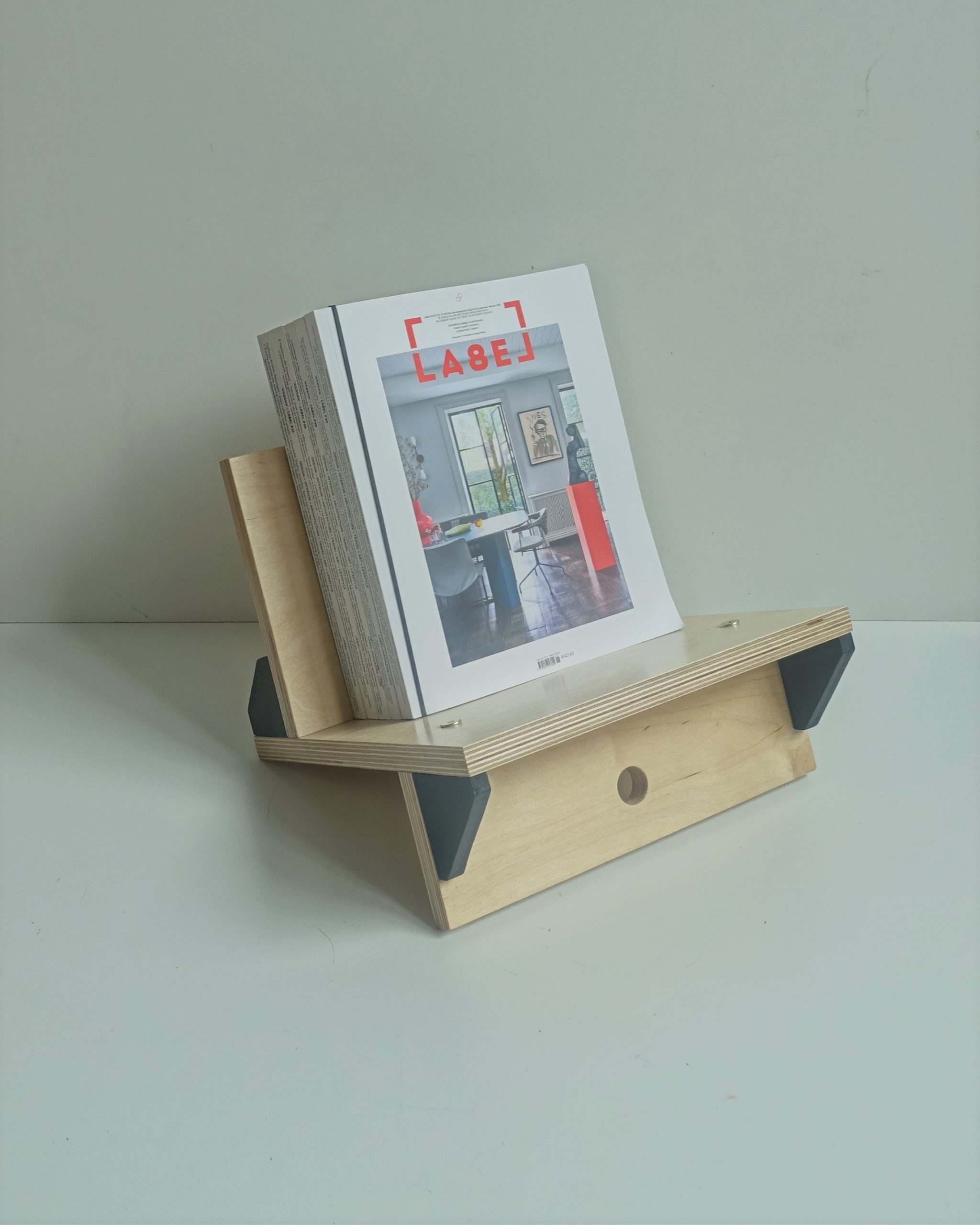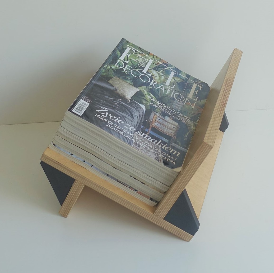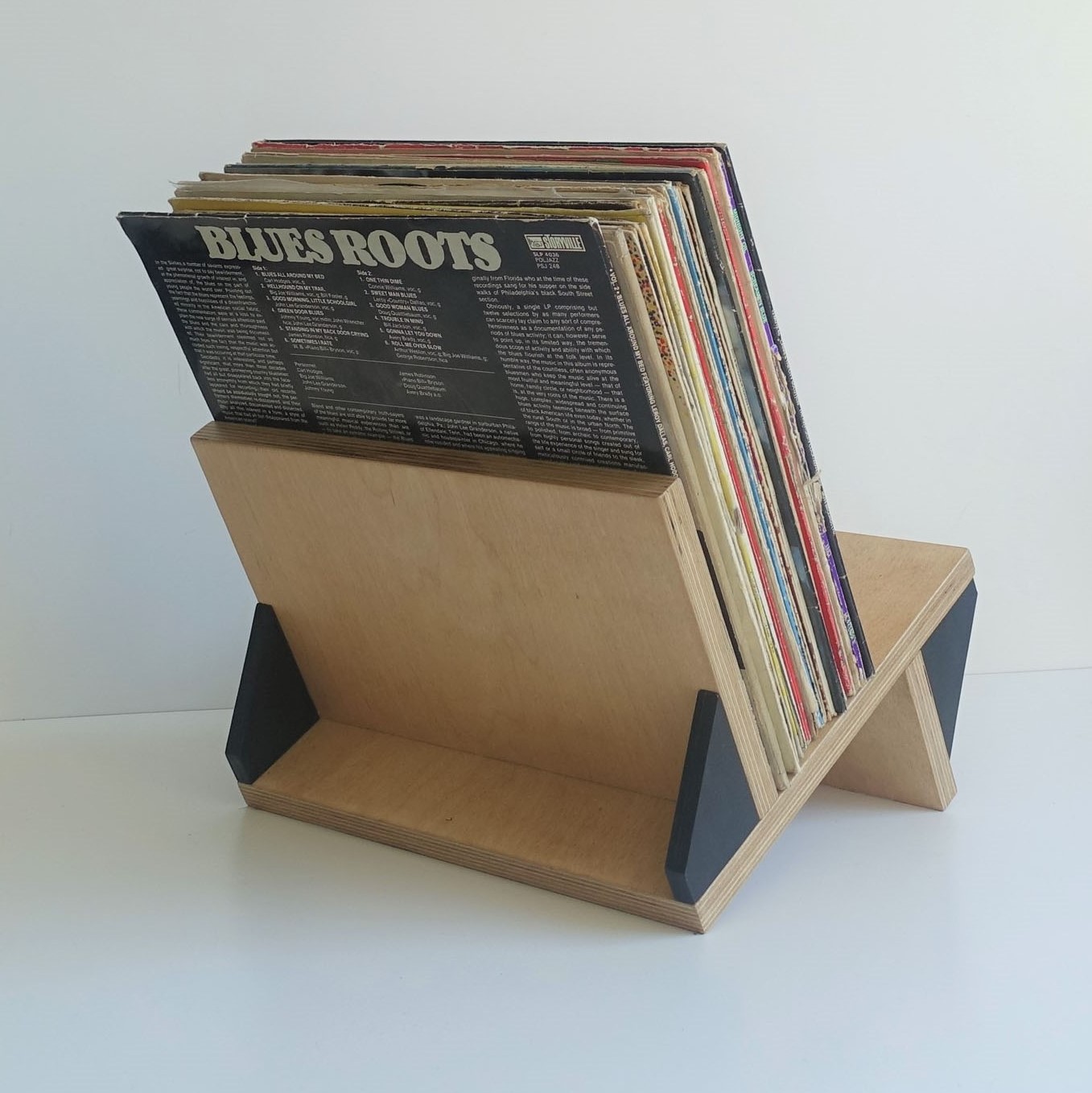 Stojak na winyle, gazety lub książki. Wiele funkcji, oryginalny design. Minimalizm. Idealnie wyważony, zmieści się na nim około 70 płyt. Stojak zrobiony jest ze sklejki grubości 18mm oraz 12mm. Wykończony wodnym, ekologicznym lakierem bezbarwnym oraz farbą wodną.