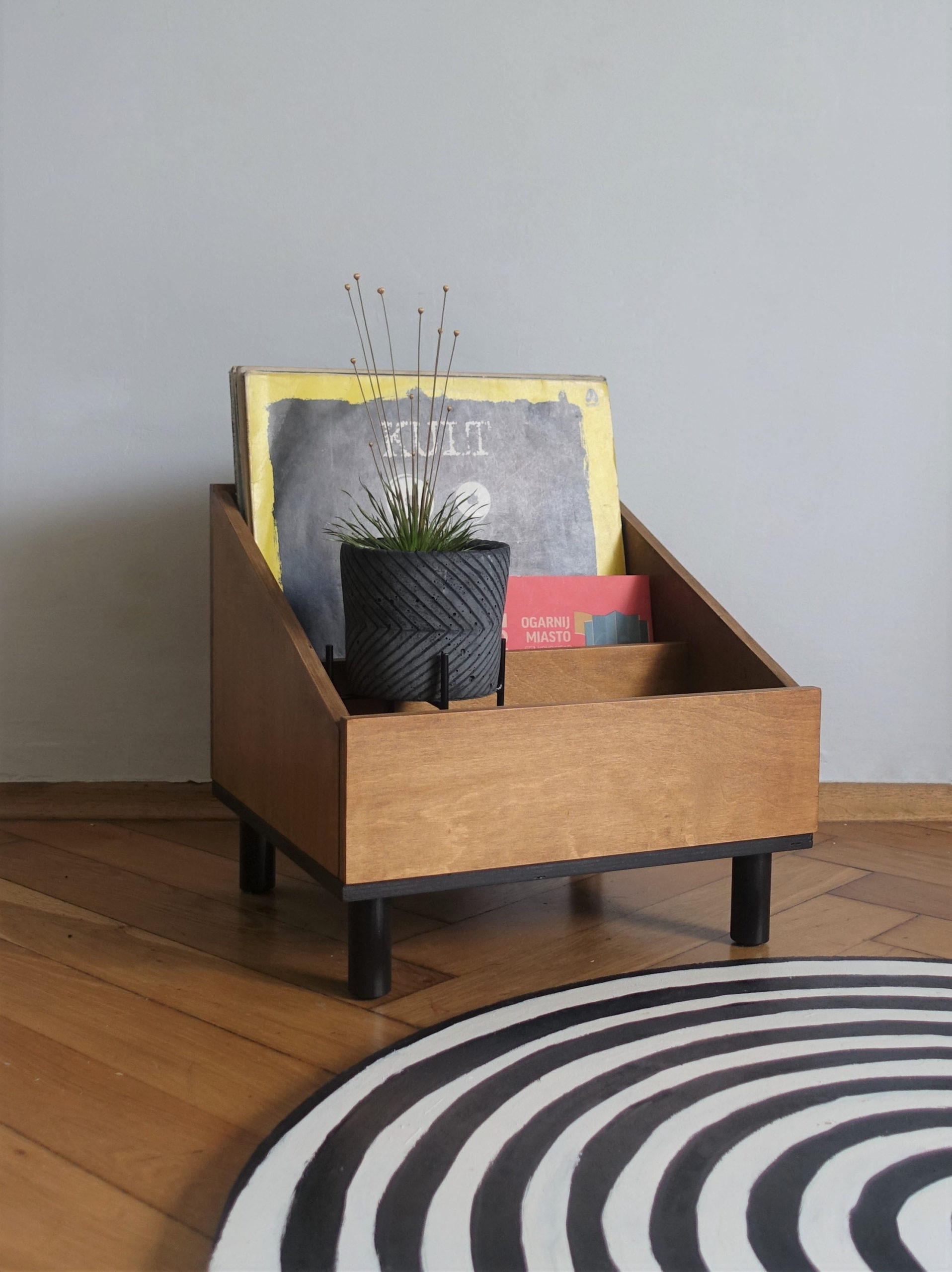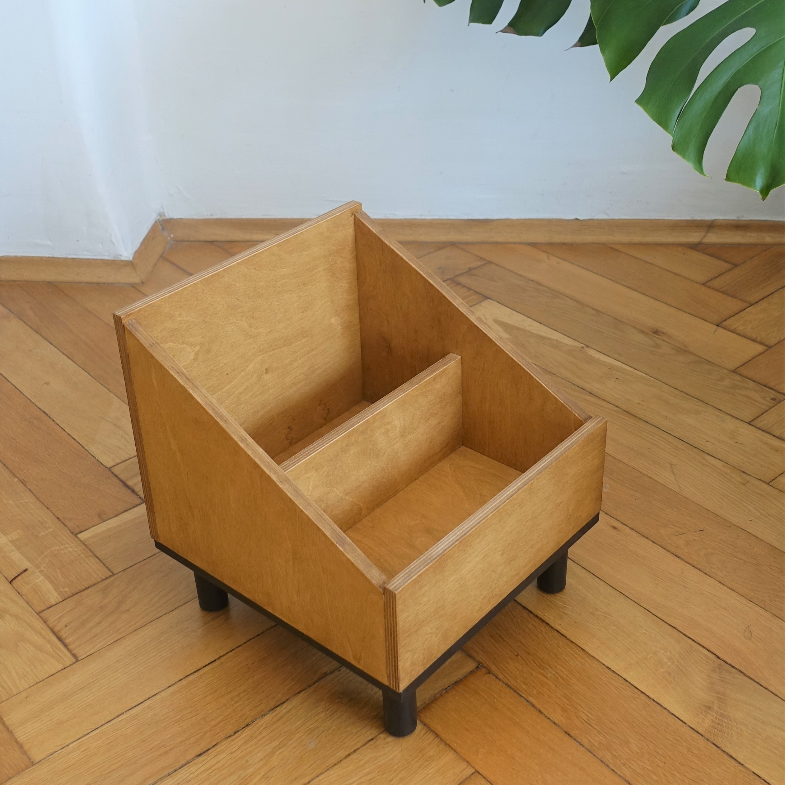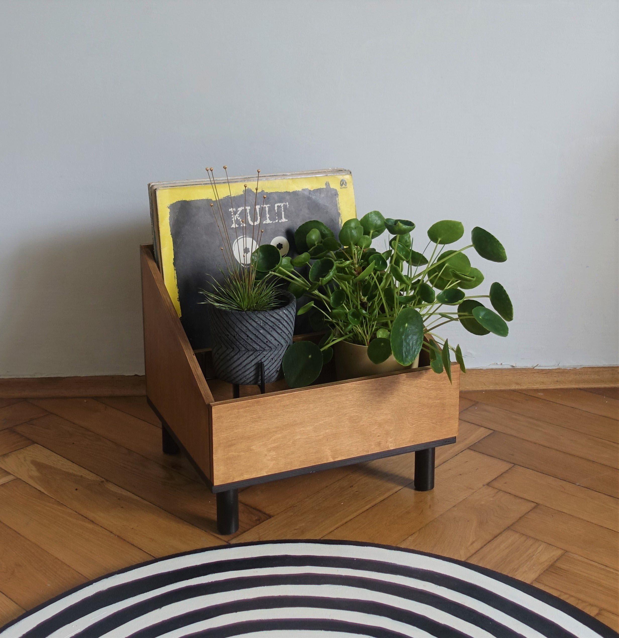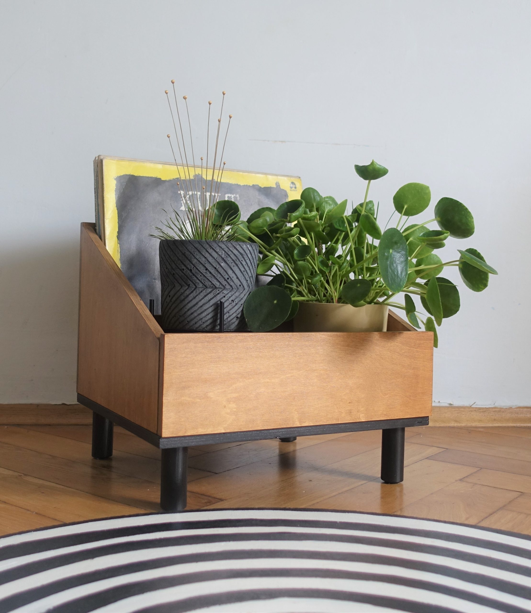 Stojak na winyle lub gazetnik … albo kwietnik! Wykonany ze sklejki, podstawę stanowią sosnowe nóżki. Lakierowany ekologicznym lakierem w kolorze średniego dębu. Podstawa pomalowana ekologiczną farbą wodną.