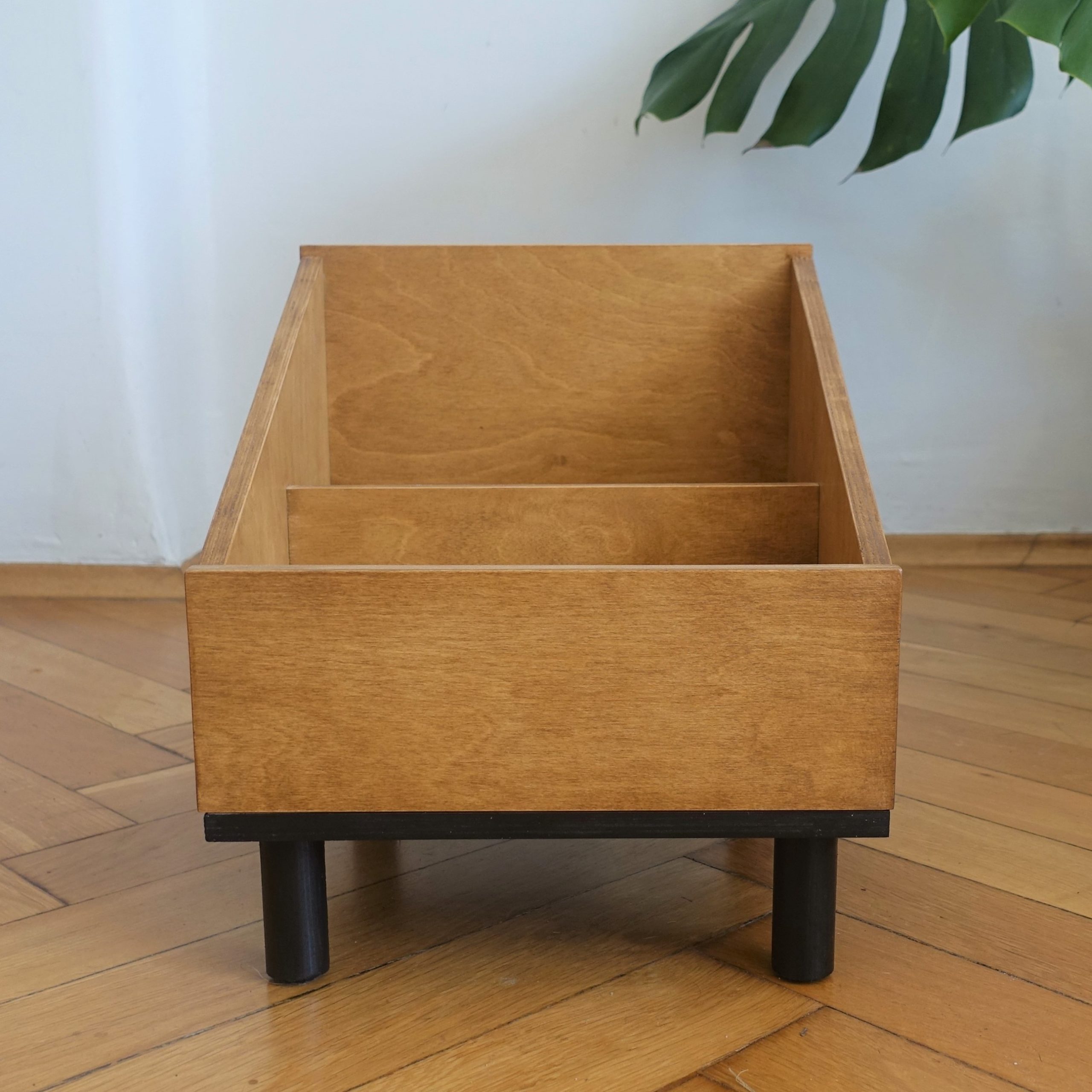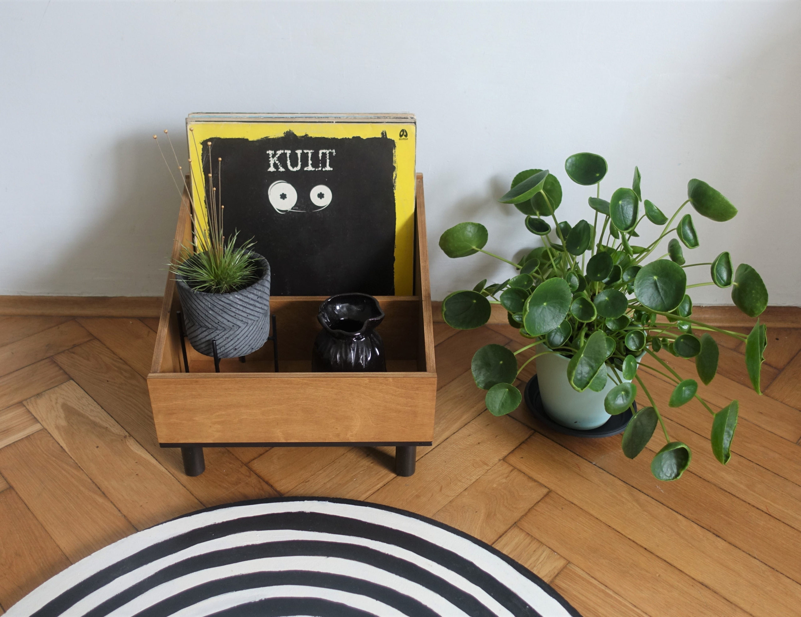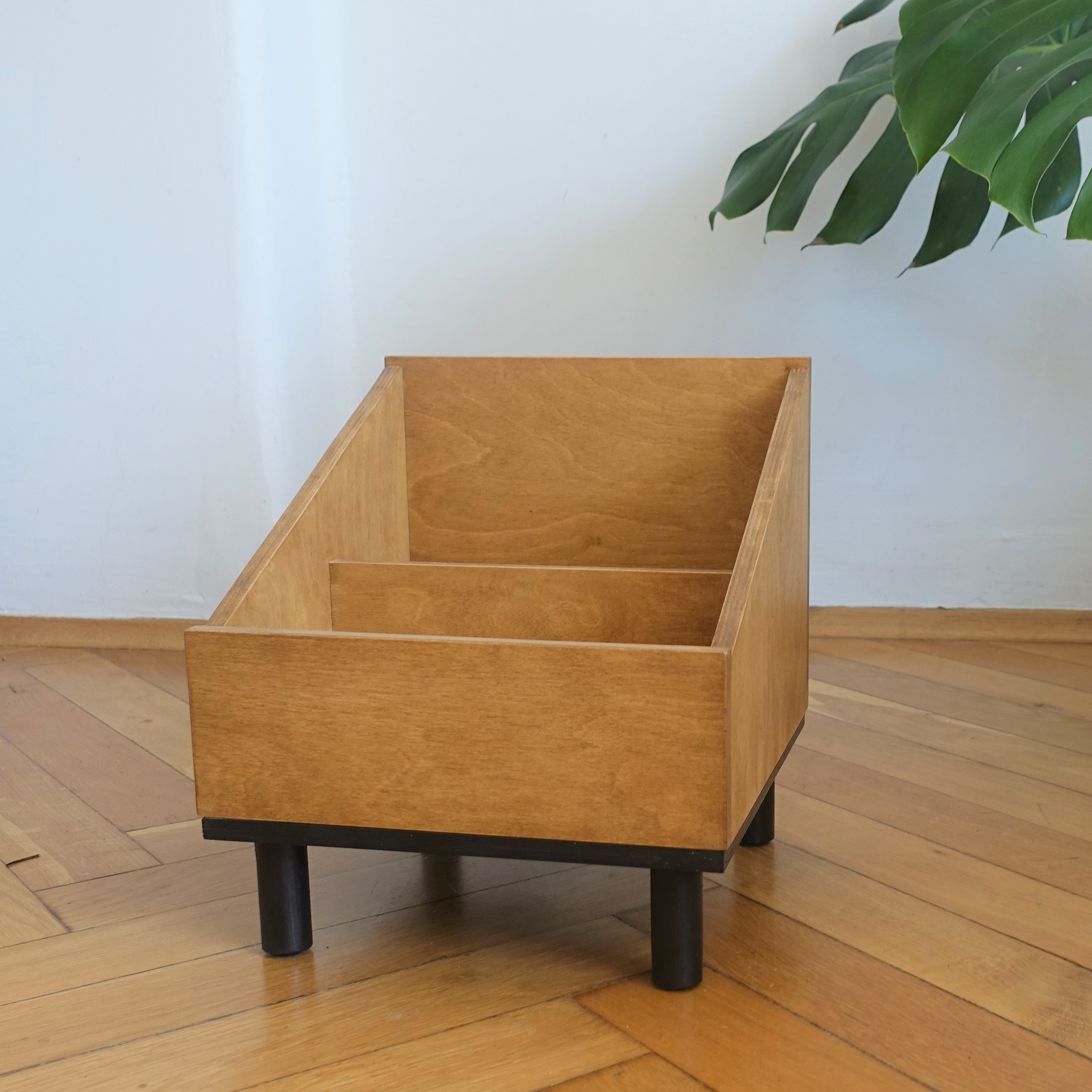 Stojak na winyle lub gazetnik … albo kwietnik! Wykonany ze sklejki, podstawę stanowią sosnowe nóżki. Lakierowany ekologicznym lakierem w kolorze średniego dębu. Podstawa pomalowana ekologiczną farbą wodną.