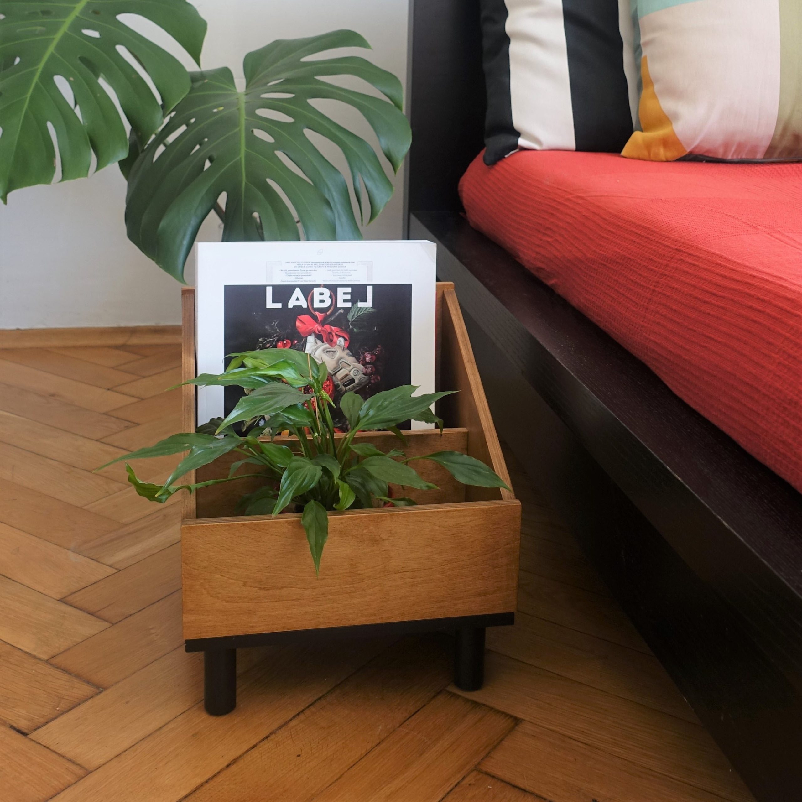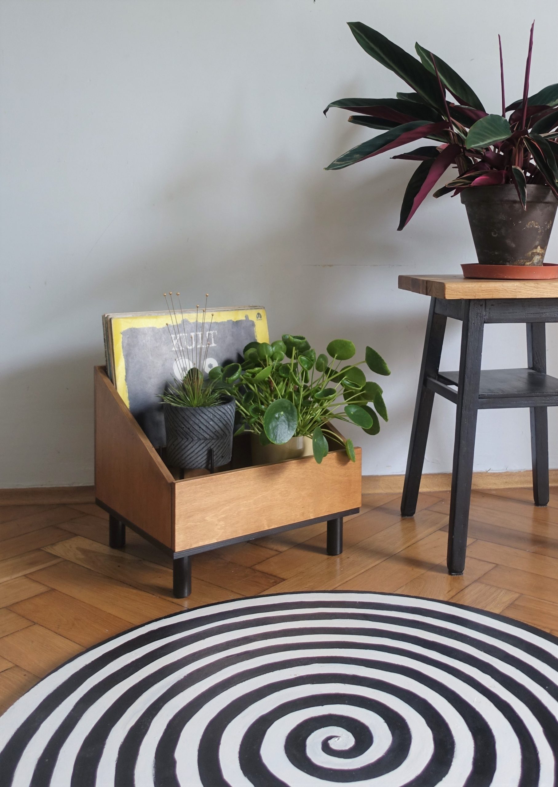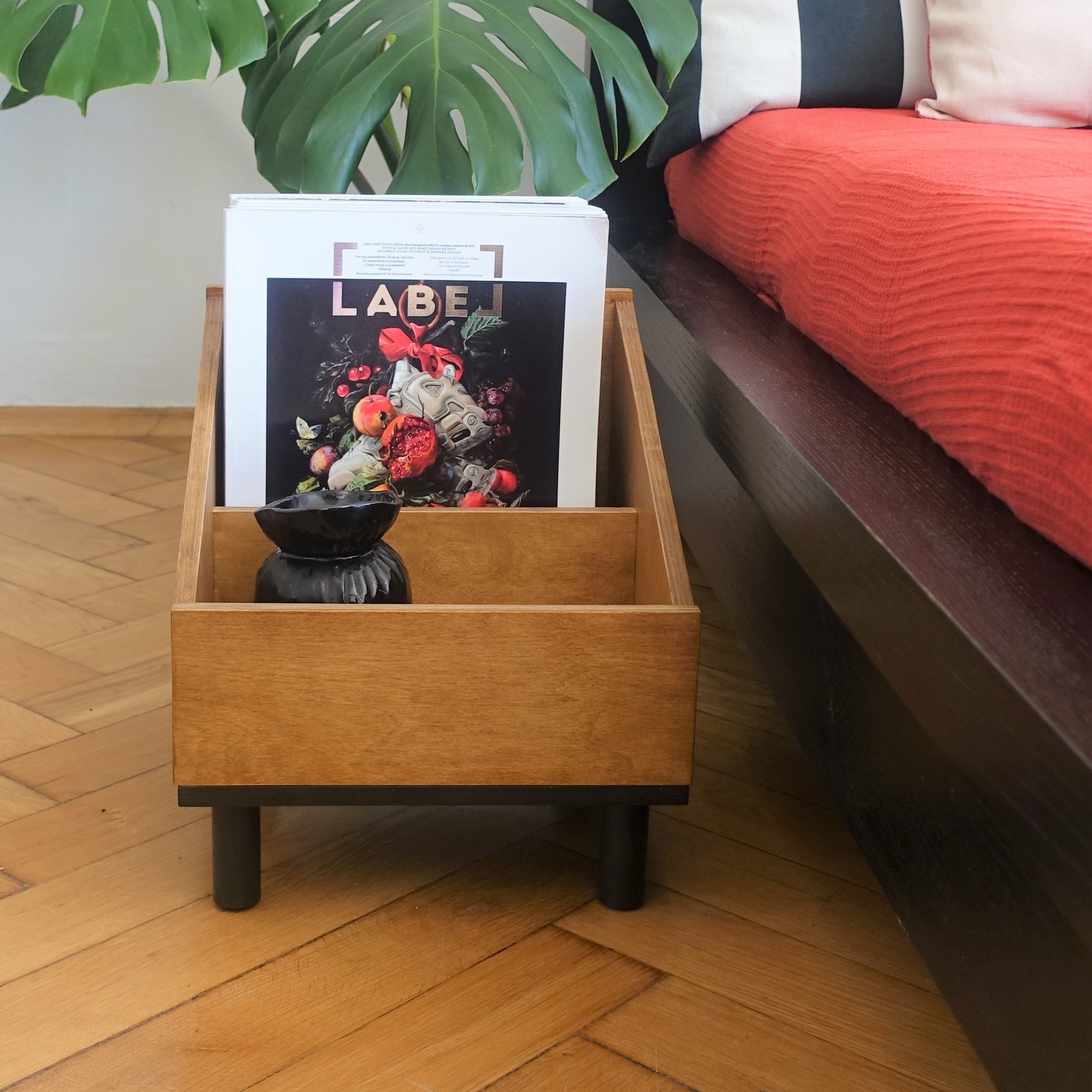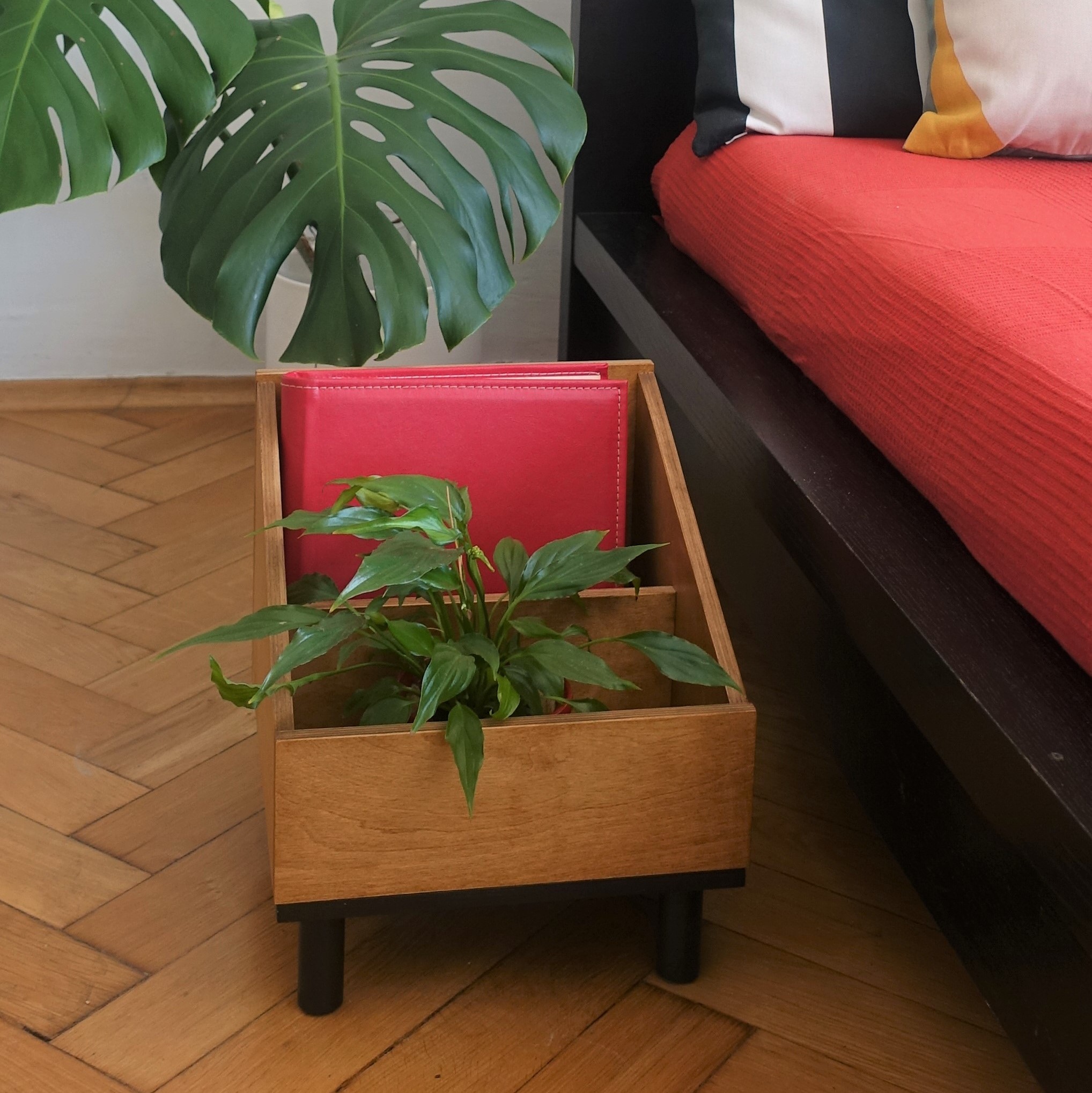 Stojak na winyle lub gazetnik … albo kwietnik! Wykonany ze sklejki, podstawę stanowią sosnowe nóżki. Lakierowany ekologicznym lakierem w kolorze średniego dębu. Podstawa pomalowana ekologiczną farbą wodną.